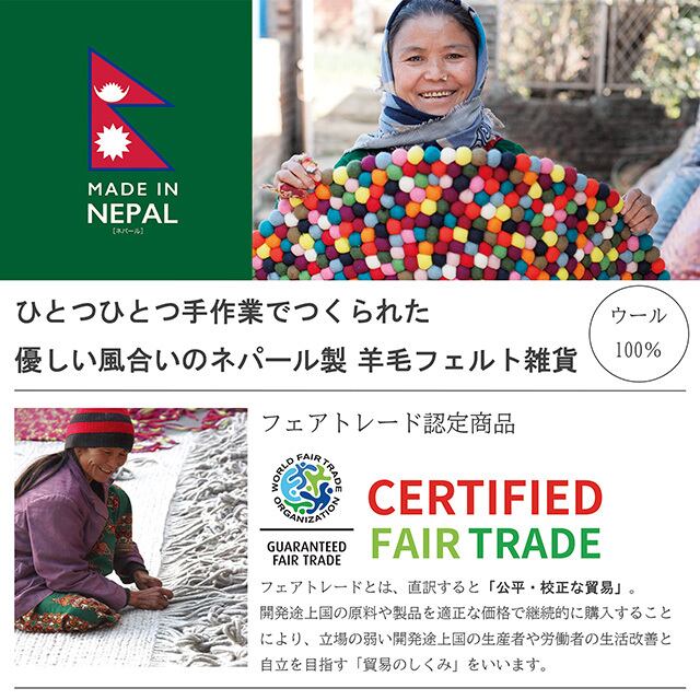 ネパールのフェルト雑貨、ストライプコースターは、カラフルなデザインが特徴です。手作りの温かみを感じるこのコースターは、テーブルを華やかに彩ります。フェアトレード認証を受けており、環境にも配慮されています。飲み物を置くたびに、異国の風を感じることができるでしょう。日常のティータイムを特別なものに変える、魅力的なアイテムです。