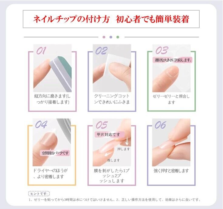 ・装着前に爪表面の水分や油分をしっかり拭き取ることで、より剥がれにくくなります。