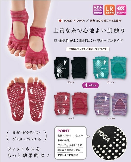 抗菌・防臭をプラスした高級糸綿コーマを表糸に100%使用 おしゃれ かわいい かっこいい プレゼント フィットネス用品【日本製】YOGAソックス 甲オープンタイプ ブラック グリーン レッド パープル 靴下 くつ下 くつした ヨガソックス 5本指 滑り止め付 選べる4カラー 滑らない ヨガ ホットヨガ ヨガウェア ピラティス ダンス バレエ 甲 かかと YOGASOCKS 男性 女性 メンズ レディース