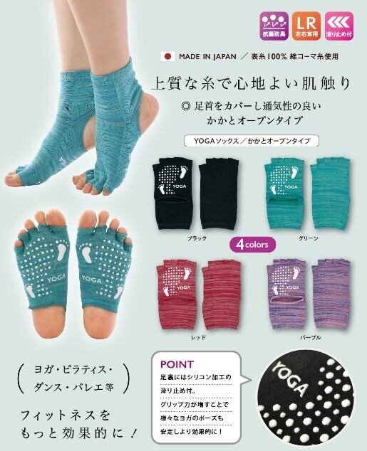 抗菌・防臭をプラスした高級糸綿コーマを表糸に100%使用 おしゃれ かわいい かっこいい プレゼント フィットネス用品【日本製】YOGAソックス かかとオープンタイプ ブラック グリーン レッド パープル 靴下 くつ下 くつした ヨガソックス 5本指 滑り止め付 選べる4カラー 滑らない ヨガ ホットヨガ ヨガウェア ピラティス ダンス バレエ 甲 かかと YOGASOCKS 男性 女性 メンズ レディース