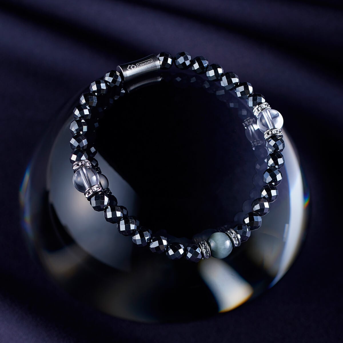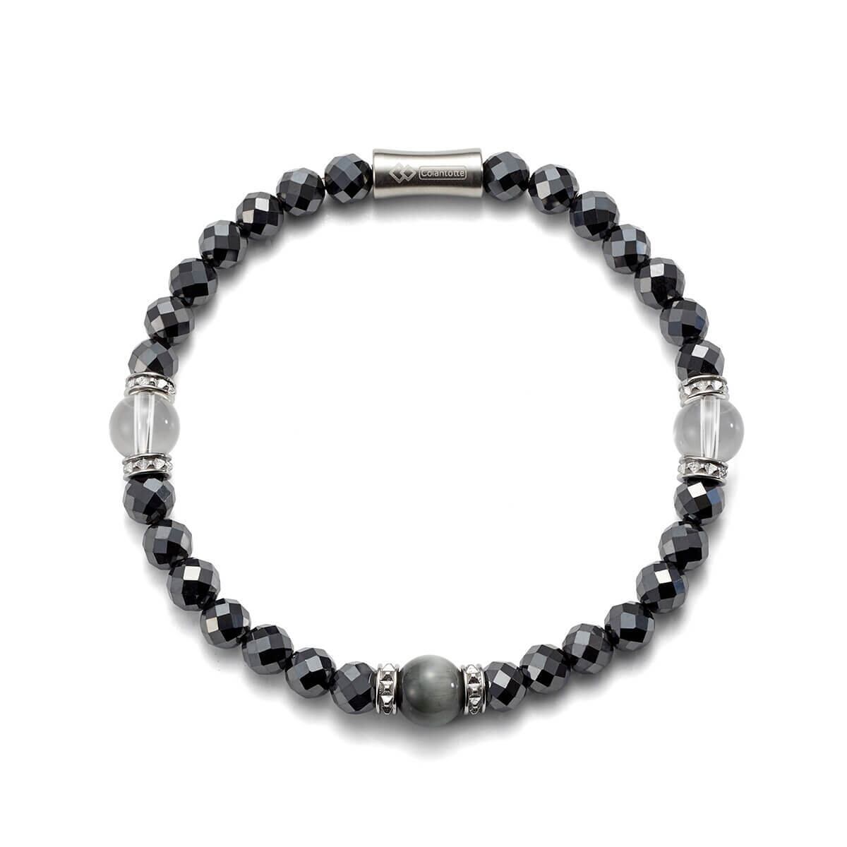 LUCEαのシンプルさに天然石の水晶とイーグルアイを組み合わせた腕用磁気アクセサリー。円柱状のColantotteのロゴ入りステンレスパーツにはヘアライン加工を施し、ロンデルパーツがアクセントとなって腕まわりに品のある印象を与えてくれます。